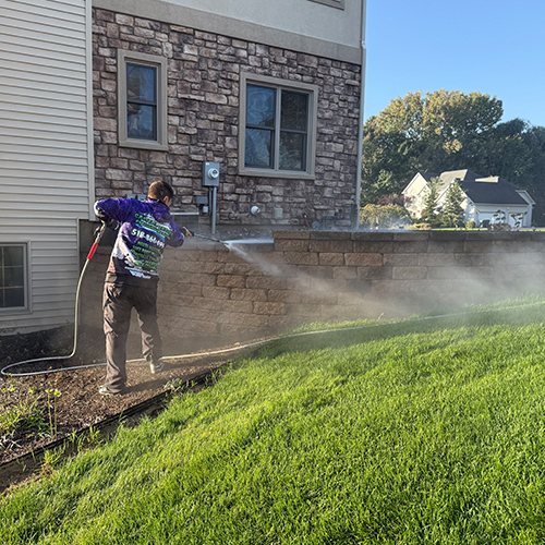 Because home exteriors are more delicate surfaces than concrete driveways or brick pavers, we perform a hybrid wash, combining the best aspects of traditional pressure washing and soft washing. Using a specialized cleaning solution and hot water, we’re able to stand 10-15 feet away from your home and apply minimal pressure for a gentler, safer clean. Yet we still have the flexibility to move closer and apply more pressure for difficult areas and tougher stains.